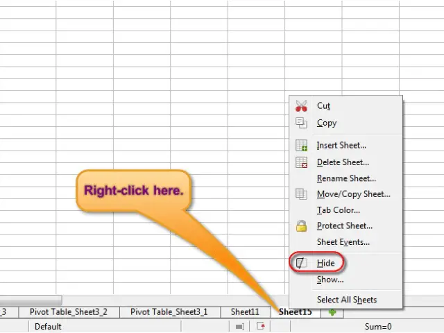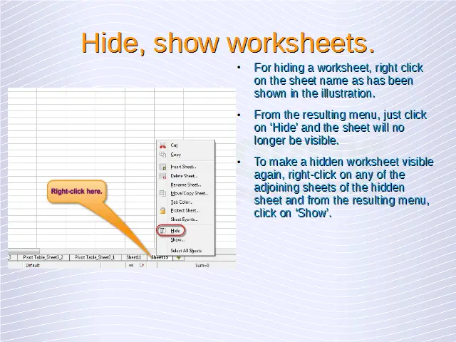 For hiding a worksheet, right click on the sheet name as has been shown below. From the resulting menu, just click on ‘Hide’ and the sheet will no longer be visible.